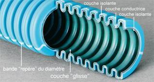 Les gaines Flex-a-ray permettent une excellente atténuation des champs électriques. Elles contiennent une couche en matériau composite électriquement conducteur, leur confèrant ainsi des propriétés de blindage contre les rayonnements électriques 50 Hz (système breveté).